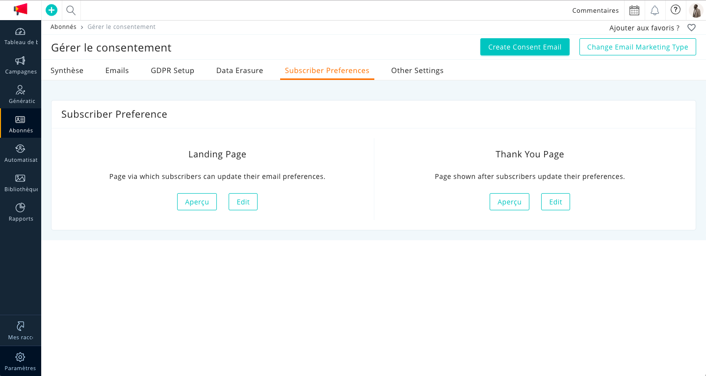 Il faut désormais se rendre dans la Gestion du Consentement (RGPD) afin d'éditer ses préférences pour les choix des abonnés